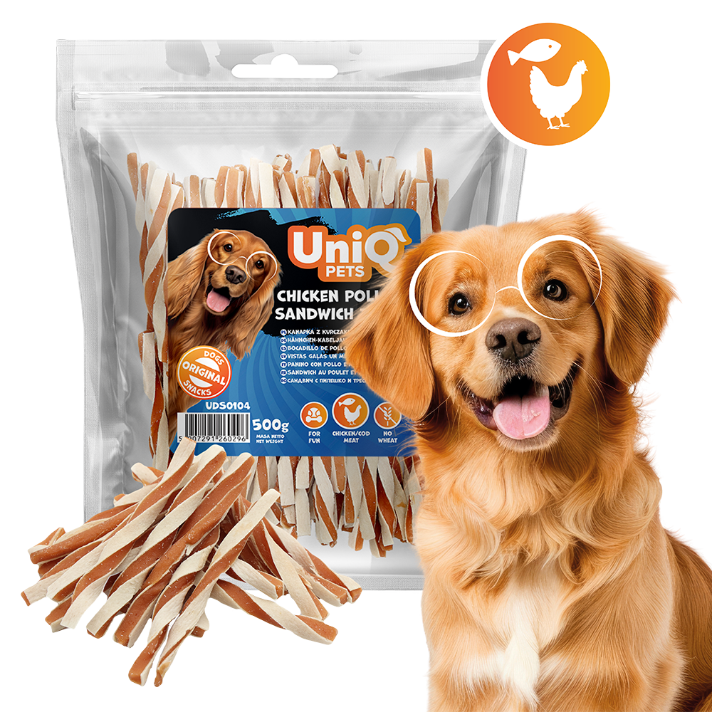 Sudedamosios dalys: vištiena 60%, menkė 30%, ryžių miltai 4%, sojos baltymai 2%, kukurūzų krakmolas 2%, daržovių glicerinas 2% Analitiniai komponentai: brutto baltymai 28%, brutto skaidulos 2,5%, brutto riebalai 3,0%, brutto pelenai 3,0%, drėgmė 18%